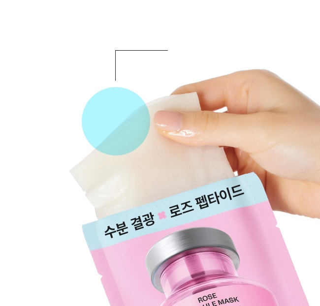 - 마스크 시트를 꺼내 얼굴 모양에 맞춰 고르게 밀착시킵니다.